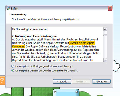 Ich weiß, kein Mensch liest sich auch nur ansatzweise die EULA Bestimmungen in Programmen durch, aber hier scheint der Copy/Paste Wolf gewildert zu haben. Will man Webseiten auf Safari testen sollte man dies unbedingt auf einem Mac erledigen, die restlichen 94% sollten es laut der EULA wieder von der Platte schmeißen. Ach, schaut einfach auf den Screenshot.